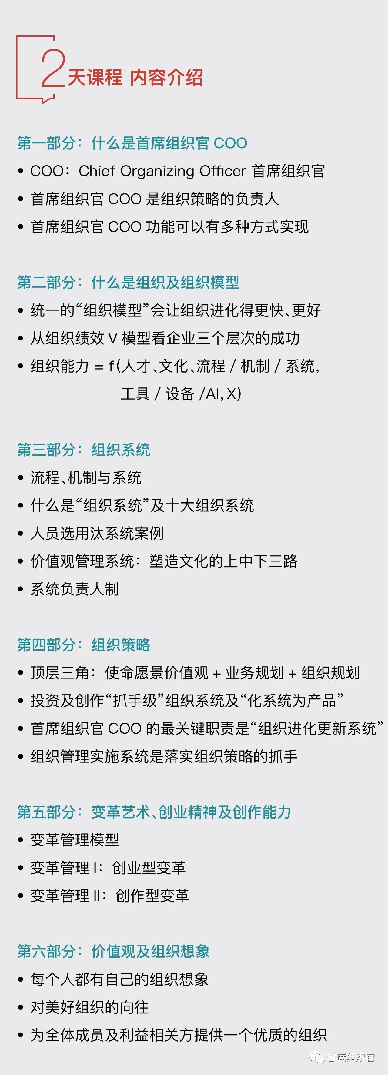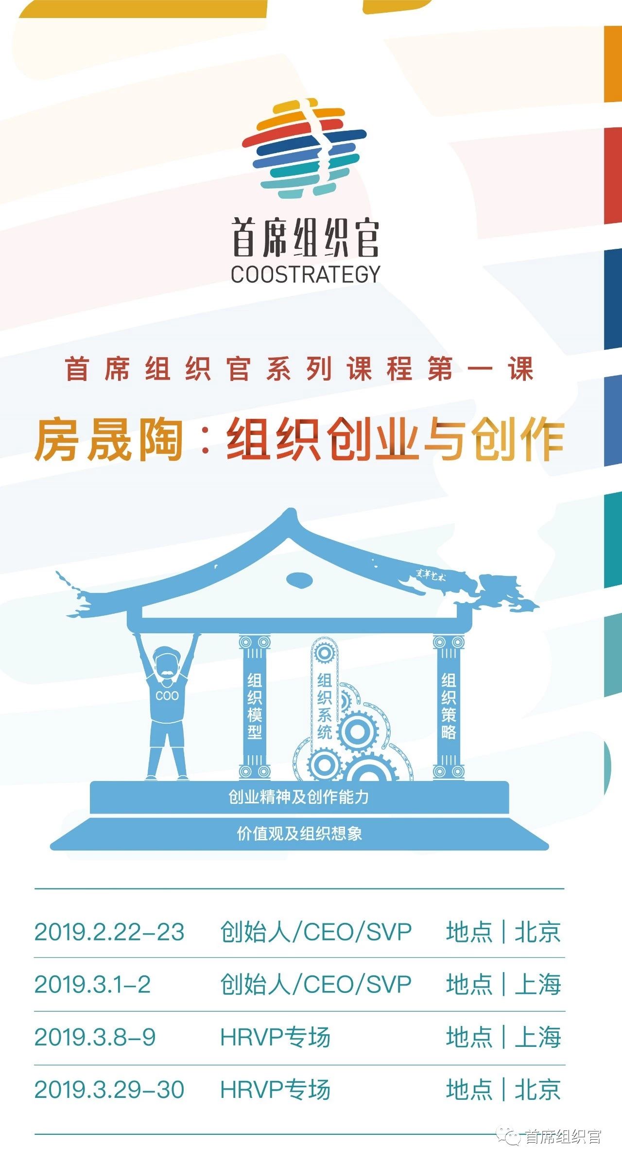 首席组织官第一课课程介绍 407 2019-01-07 08:00:00 首席组织官系列公开课 推荐阅读 房晟陶:对美好组织的向往 房晟陶:野蛮成长不是忽视组织建设的充分理由 房晟陶:没有系统能力和法治精神就不会有真正的组织 房晟陶:企业里为什么没有首席组织官这个岗 从团伙到组织,高管要学会当“官守议员” 房晟陶:人力资源部要不要改名?切忌换汤不换药 建组织要先“toB”再“toC”;先“公正”再“仁爱” 看了这几张图片,你会更全面地理解中美贸易战 专业多一分,组织里的政治就会少半分 一个组织由哪些“系统”构成?如何以“系统”之眼看组织? 人才最重要?很多“涉世未深”的老板正在深受其害 内功不可乱练;困难期是更新“组织策略”的机会期 某老板说我是他在“组织”方面的“苍老师” 组织方法论分层更有效,你用对了吗? 如何塑造文化?绝大部分公司都忽视了中三路。 真正的组织创作需要在“源头”上用力 从团伙到组织的关键是能否有五六个“真高管” “善变”的组织才是真正的组织 建组织不能“干大事而惜身,见小利而忘命” 有真故事的组织才能凝聚高量级的人才 首席组织官新年寄语:文化不是“落地”出来的